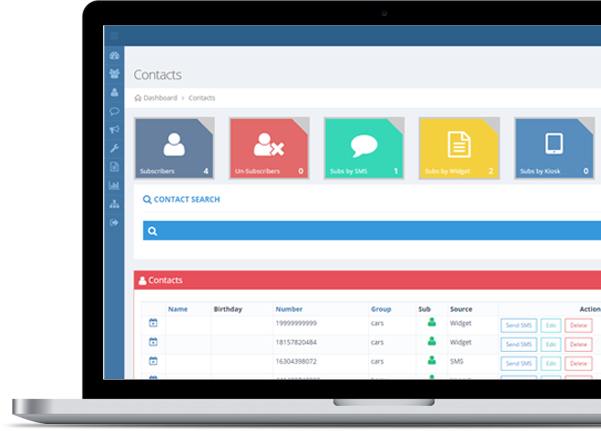 Manage your professional list of subscribers in our contact management module. View the source of all sign-ups, whether they signed up through SMS keyword, web widget, kiosk, or if they were manually added.